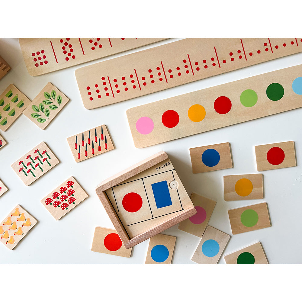 Included in the set are 50 wooden tiles featuring objects to count, helping children practice counting and number recognition. The set also comes with 20 wooden color tiles, allowing for color sorting and recognition activities. This combination of visual and tactile elements supports a wide range of learning activities, making it an excellent resource for developing both cognitive and motor skills.